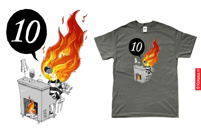 ‘Limited edition t-shirt in military green met de jubileumprint van Music Around The Fireplace. Een echte eyecatcher voor fans van akoestische muziek, kunst en vuur. Of je er nou ooit live bij was of net kennismaakt met ons concept: dit shirt verbindt je met de magie van 10 jaar muzikale huiskamermomenten.’