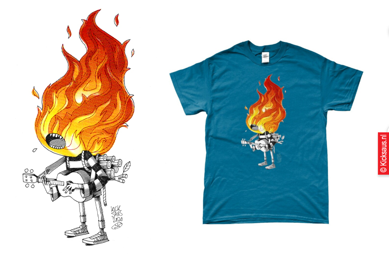 ‘Illustratie door Kicksaus (tevens DJ bij Music around the fireplace). Joh wat een lekker shirt! Zacht en lichtgewicht, met precies de juiste hoeveelheid stretch. Met deze aankoop help je het vrijwillige initiatief Music around the fireplace te verbeteren. 8000 Karma-punten!’